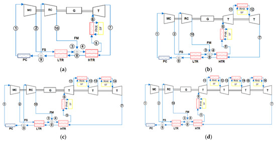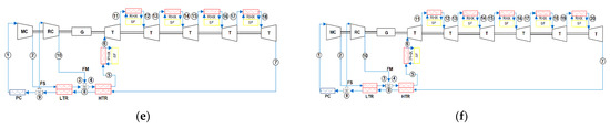 Layout of recompression Brayton cycle (a), with reheating (b), with two reheatings (c) with three reheatings (d), with four reheatings (e), and with five reheatings (f). MC: main compressor; RC: recompressor; G: generator; T: turbine; PC: precooler; FS: fluid split; FM: fluid mixture; LTR: low-temperature recuperator; HTR: high-temperature recuperator; PHX: primary heat exchanger; RHX: reheating heat exchanger; SF: solar field.