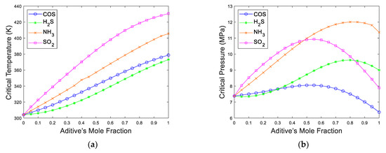 Fluids properties vs. additive’s mole fraction. (a) Critical temperature, (b) critical pressure.