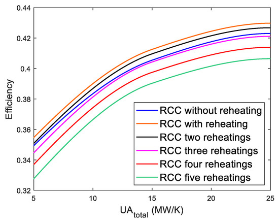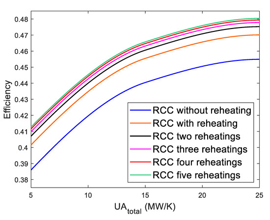 Cycle efficiency vs. UAtotal. RCC Brayton cycles using pure s-CO2 without pressure drop.