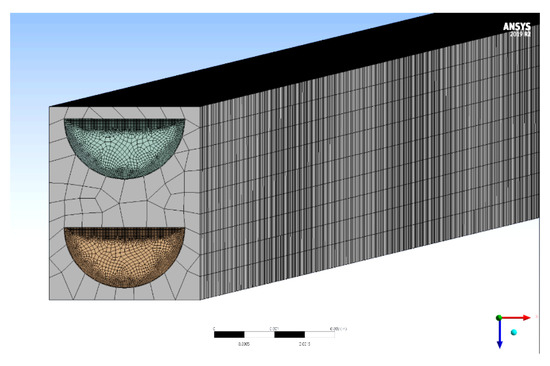 For the CFD simulation, the Ansys Fluent 2019 R2 software was used. Figure 4 shows the modeling of two PCHE exchange channels, a cold channel and a hot channel. The channels have a diameter of 2 mm and a maximum length of 200 mm. Due to its good behavior under high-temperature conditions and pressure, the Iconel 617 alloy was chosen as the material of the solid domain of the exchanger whose thermophysical properties are assumed constant—with a temperature of 298.7 K, the density is () , the isobaric specific heat , and the thermal conductivity