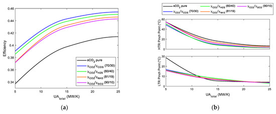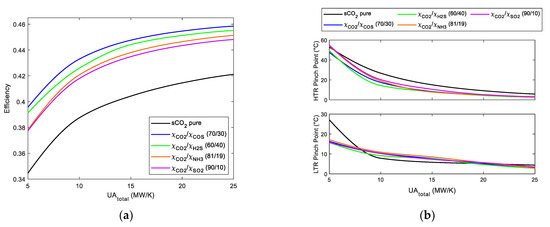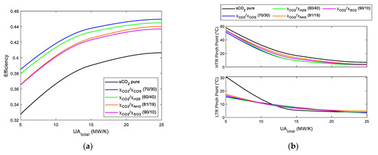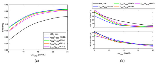 (a) Cycle efficiency vs. UAtotal. RCC with three reheatings Brayton cycles using s-CO2 mixtures. (b) LTR and HTR pinch point vs. UAtotal. RCC with three reheatings Brayton cycles using s-CO2 mixtures.