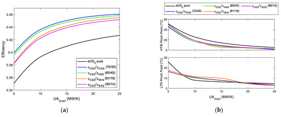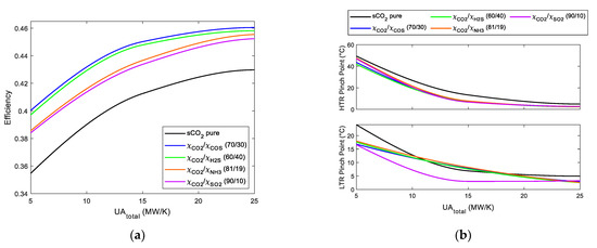 (a) Cycle efficiency vs. UAtotal. RCC with reheating Brayton cycles using s-CO2 mixtures. (b) LTR and HTR pinch point vs. UAtotal. RCC with reheating Brayton cycles using s-CO2 mixtures.