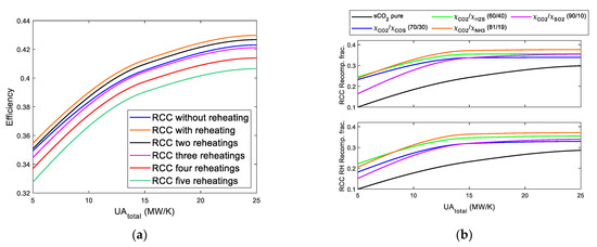 Recompression fraction vs. UAtotal. (a) RCC Brayton cycles using pure s-CO2; (b) RCC and RCC with reheating Brayton cycles using s-CO2 mixtures.