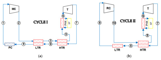 Division into two parts of the recompression Brayton s-CO2 power cycle. (a) Cycle I and (b) Cycle II.