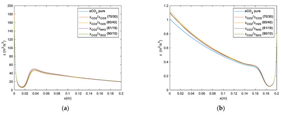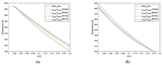In most cases, the optimal efficiency is obtained when the working fluid’s critical point is close to the compressor inlet temperature (CIT). It can be observed that the mixtures that imply the best cycle efficiency are s-CO2/COS (70/30) and s-CO2/H2S (60/40). These mixtures increase the cycle efficiency between 3 and 4 points (Figure 7a, Figure 8a, Figure 9a and Figure 10a). Whereas, the mixtures of s-CO2/NH3 and s-CO2/SO2 with molar fractions of (81/19) and (90/10), respectively, increase their efficiency between 2 and 3 points (Figure 7a, Figure 8a, Figure 9a and Figure 10a).