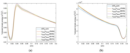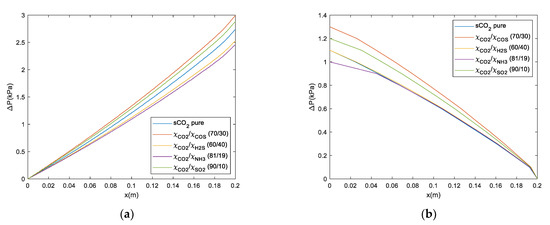 However, in Figure 11a and Figure 12a, the best cycle efficiency is obtained with the mixtures s-CO2/COS (70/30) and s-CO2/H2S (60/40). These mixtures increase the cycle efficiency between 5 and 6 points. Whereas, the mixtures of s-CO2/NH3 and s-CO2/SO2 with molar fractions of (81/19) and (90/10), respectively, increase their efficiency between 3 and 4 points. Furthermore, the results indicate that as the number of reheats increases, the gap between the mixture’s efficiency with carbonyl sulfide and hydrogen sulfide widens.