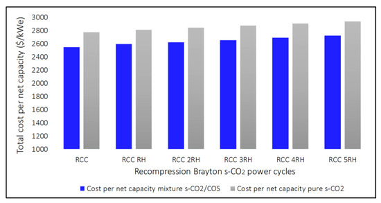 As shown in Figure 13b and Figure 14, the mixture composed of s-CO2 and ammonia (81/19) needs to divert more mass flow to the recompressor to maximize its efficiency. However, it is not the one that gets the highest thermal efficiency. In contrast, the mixture composed of s-CO2 and carbonyl sulfide (70/30) is the one that has the lowest mass flow rate the recompressor has to divert to maximize its efficiency, and it is the one that obtains the best thermal efficiency in the different configurations of the cycle.