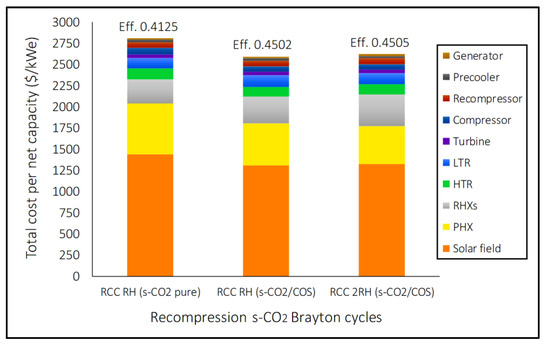 In this sense, supercritical carbon dioxide (s-CO2) Brayton power cycles have been identified as a suitable candidate for next-generation CSP (CSP Gen3) applications as they can operate at higher temperatures achieving increased thermodynamic performance [3,4,5]. Various configurations of the s-CO2 Brayton cycles (simple, recompression, recompression with main compression intercooling and partial cooling) are currently under study [6,7,8,9,10]. In the work of [7], it was determined that the recompression cycle showed the best performance compared to other configurations, i.e., simple, pre-compression, and split expansion. Furthermore, several studies by [6,11,12] showed that the recompression, partial cooling, and intermediate cycles are the most efficient circuits and even more so when they have reheating.