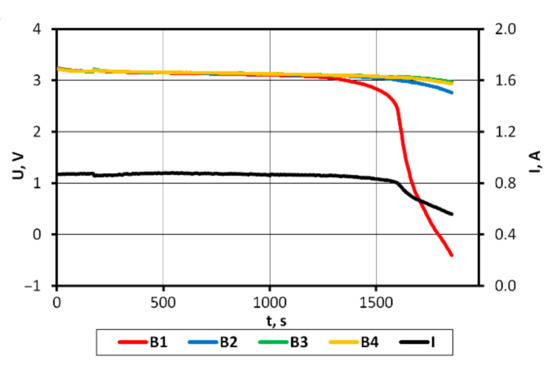 The tests were carried out with the use of commonly available APR 18650M 1A batteries manufactured by A123 Systems company (Novi, MI, USA). Fresh batteries, never used before, were used for the tests. Based on previous measurements of the properties of APR 18650M 1A batteries, carried out by the authors on lots from various deliveries, it appears that the state of charge of the new batteries was approximately 50%. Within one lot, it was found that there were variations between the individual units of up to 50 mAh. For these reasons, the battery marked as B1 was discharged by 50 mAh, which was about 4.5% of the nominal capacity (1100 mAh), for the tests. Then the batteries were connected in series to form a pack (Figure 1).