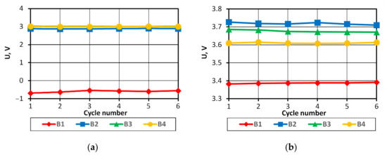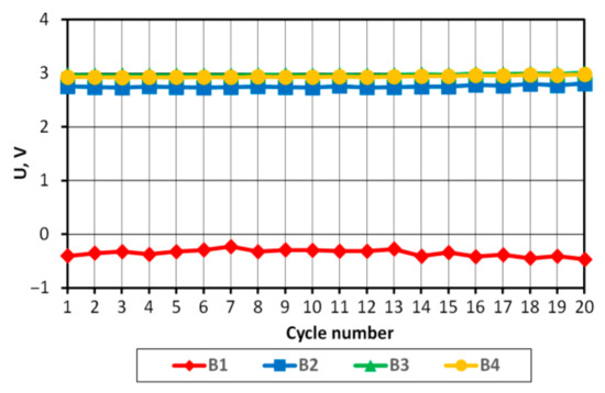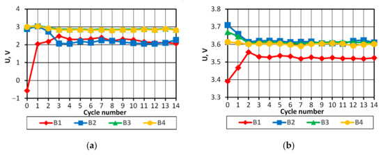 The initially introduced imbalance at the 4.5% level lead to an over-discharge state of the weakest battery (B1) already at the first discharge, bringing it to a voltage well below the lower allowable limit of 2 V [20]. There was a negative voltage on this battery in the final phase of the discharge (reverse polarity). The value of this voltage indicated the degree of over-discharge of the cell [10].