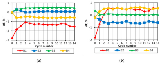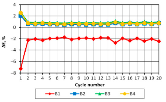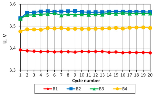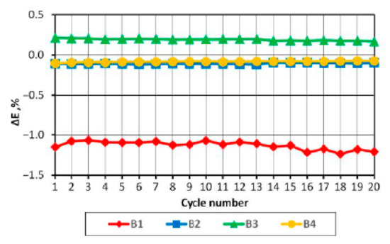 In all the cycles, in the discharge phase, the B1 battery was excessively discharged, while in the charging phase, the batteries B2 and B3 were charged to the highest voltage. In the first seven discharge/charge cycles, a minimal reduction of unbalance could be observed, which may have resulted from the phenomenon of increasing the capacity of LiFePO4 batteries and stabilization of their parameters in the initial period of use [23]. The average level of unbalance of the battery B1 calculated from the energy received during the discharge for all the cycles starting from the second one (the first cycle was omitted due to incomplete initial charging of the batteries) was 3%. Fluctuations of ±0.5%, which occurred, should be attributed to the measurement uncertainty. Starting from the fifteenth cycle, a minimal trend towards an increase in the differences between the B1 battery and the other three batteries included in the pack could be observed. In order to confirm this trend and possibly establish its pace, it is necessary to execute more measurement cycles.