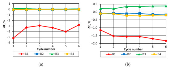 Differences in energy in successive discharging/charging cycles with the UCT100-6-type charger, calculated in accordance with the Formula (10): (a) discharging; (b) charging.