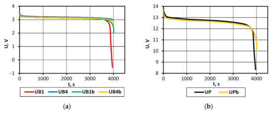 Voltage characteristics during the discharge of the pack batteries with and without BMS: (a) B1 and B4 (UB1, UB4—without BMS; UB1b, UB4b—with BMS) battery voltage; (b) pack voltage (UP—without BMS; UPb—with BMS).