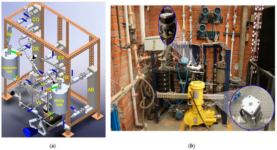 Figure 2a shows a diagram of the main mechanical components of the experimental SACS. Its support structure’s dimensions are length 1 m, width 0.8 m, and height 1 m, including the instrumentation for measurement and analysis. All components, including the pipes, valves, and accessories, are made of stainless steel to prevent corrosion. Five high efficiency plate heat exchangers were used, all of them oriented vertically; with 40 plates for DE, HX, and AB and 20 plates for CO and EV. Figure 2b shows a photograph of the experimental system.