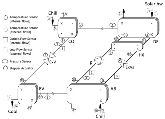 To evaluate the behavior of the SACS, it was necessary to measure some thermodynamic variables such as temperature, pressure, and mass flow of the weak and strong solution, cooling water (AB, CO), heating water (DE), and chilled water (EV). The variables were measured using electronic instruments: 20 RTD temperature sensors (PT1000) to register the flow temperatures at the inlet and outlet of each heat exchanger, 4 piezoelectric pressure transducers placed at the outputs of the DE, CO, EV, and AB; 3 Coriolis flowmeters, the first between the HX and AB heat exchanger for the weak solution, the second between the desorber and heat exchanger for the strong solution, the third between CO and EV and 4 rotameter-turbine flowmeters, at the inlets of external pressure flows. The location of each sensor in the SACS is shown in Figure 3.