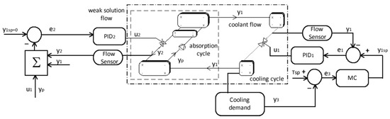 Figure 4 shows a scheme of the feedback control loops. The objective is to maintain the cooled water temperature in the evaporator at TSP. The process variable in this first control loop is the measured temperature y3; its difference is the error e3. On the other hand, flow is the measured process variable y1 of a cascaded control loop, whose set point y1 SP is determined by a model-based relationship between the temperature error e3 and the desired flow of refrigerant from CO to EV (in the figure shown as the manual control (MC) block). Another control loop is needed in the weak solution circuit between DE and AB to ensure that increasing the flow in the strong solution circuit is compensated by a decrease in the mass flow between DE and AB, which comprises the process variable y2. Therefore, the objective of this control loop is to maintain the sum (y1 + y2) at a constant value yp, the mass flow of strong solution induced by the solution pump p (see Equation (20)).