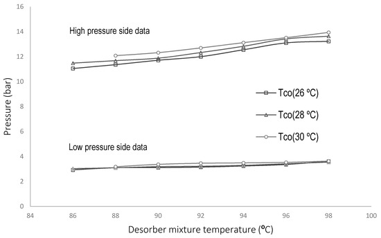 Figure 5 shows the behavior of the system pressures for a characteristic test: high (CO, DE) and low (EV, AB). Hot water was supplied to the system from 95 to 110 °C, which means 86 to 98 °C in the internal solution mixture; the cooling water used to extract the thermal energy in AB and CO was provided at 26, 28, and 30 °C. The system operated in steady-state conditions and was manually tuned.