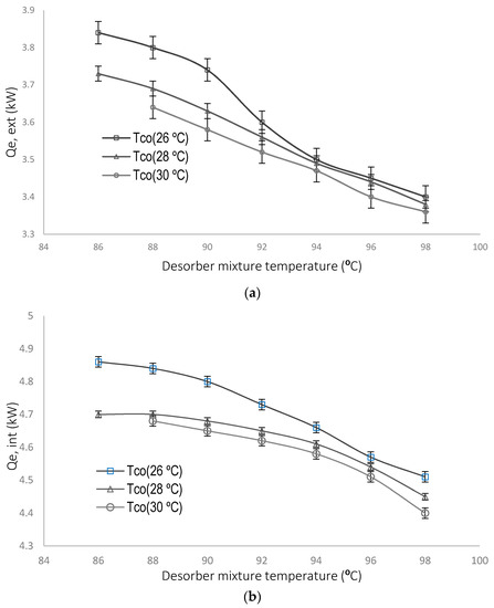 Figure 6 shows the external (a) and internal (b) evaporator cooling powers (QEV) varying the heating temperature supplied to the desorber and for different cooling water inlet temperatures at CO and AB. The maximum cooling capacity obtained is 3.86 kW external and 4.87 kW internal at 95 °C hot water, 86 °C solution temperature at DE, and 26 °C cooling water in CO.