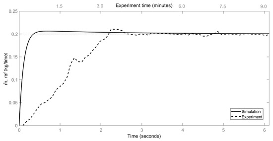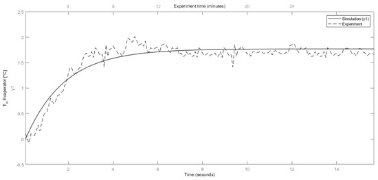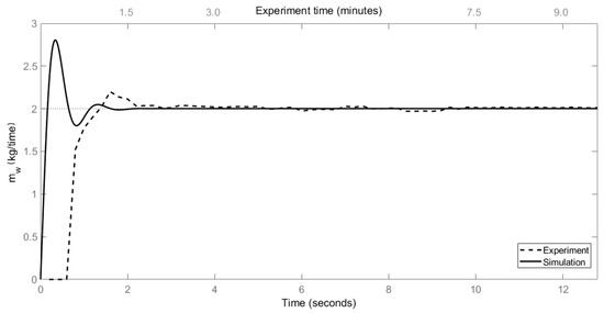 For calibrating the gains of the PID controller, Nichols and Ziegler’s open-loop tuning techniques were followed using the simulation model (Table 5); having the ultimate gain and frequency, the parameters of Table 3 can be obtained. Figure 9 and Figure 10 show a good agreement between simulation and experiment. In the simulation, constant parameters were assumed. Several experimental limitations have already been described throughout this text, and thus, a direct comparison is not feasible. However, the simulation trends can be related and compared qualitatively to those of the experiment. According to this purpose, the experimental tests are only compared with each other. Even so, correction measures have been applied to the experimental parameters for the comparison of the experimental test and the calculation of the COP.