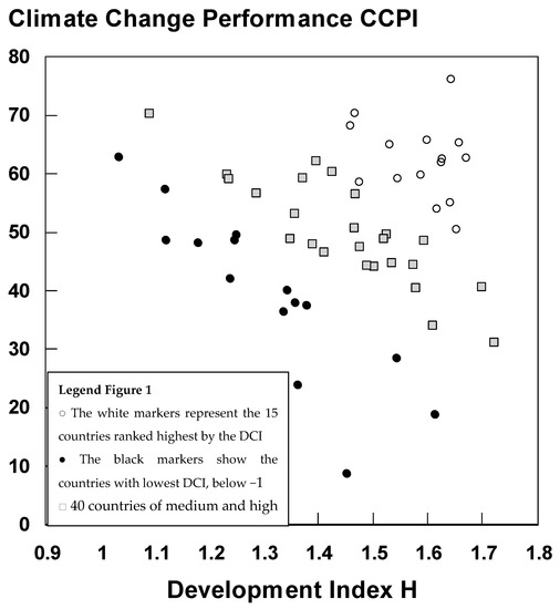 In Figure 1 the CCPI is plotted against the development index H, showing wide differences and no apparent relationship between the measures of human development and climate change performance. The white markers in Figure 1 represent the 15 countries ranked highest by the DCI, a relatively narrow cluster of European countries with H between 1.5 and 1.7 and CCPI from 58 to 77. The 15 black markers show the countries with lowest DCI, below–1. These countries are clearly distinct from the 40 countries of medium and high rank; their DCI range is narrow but their H and CCPI ranges are both very wide, many showing poor performance in development or climate change performance or both. There are some big outliers, notably developed countries that would be expected to show better climate change performance, together with other countries of high climate performance relative to their development.