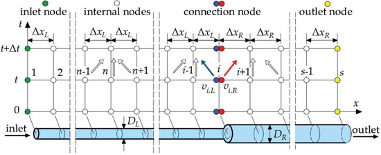 In order to numerically solve the set of Equations (2) and (10), the MacCormack predictor–corrector finite difference explicit scheme was used [20,21]. This method is widely used in computational fluid dynamics [22], but it was only recently adapted to simulate water hammer in elastic pipes by [23] and also successfully used in [24]. In this model, the time step is no longer subjected to the spatial step, and thus, it is more convenient for meshing variable property series pipes than the classic method of characteristics is. The numerical grid was divided into sections that represent individual pipes with given properties. This allows for assigning different values of input data corresponding to each pipe (i.e., inner diameter, creep compliance, retardation time, number of Kelvin–Voigt elements). The pressure wave travels in the pipeline through the junction node connecting individual pipes. To illustrate the discretisation scheme and solving process, a numerical mesh is shown in Figure 2.