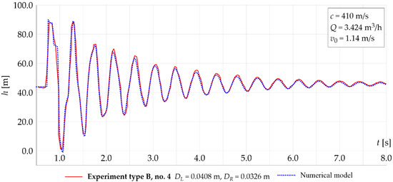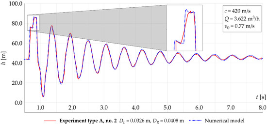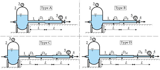 The pipeline systems denoted as “Type A” and “Type B” consisted of two serially connected pipes, whereas the systems denoted as “Type C” and Type D” consisted of three serially connected pipes. The internal diameters of the individual pipes are denoted with “L” (as in “left”), “M” (middle) or “R” (right) subscripts. For the purpose of this investigation, 6 experiments were conducted (2 tests each for Type A and Type B experiments and 1 test each for Type C and Type D experiments). The main characteristics of the experimental installation and registered steady flow parameters before initiation of the water hammer phenomenon are reported in Table 1.