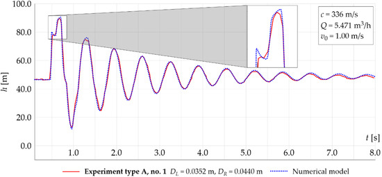 In the hydraulic transient data (Figure 4, Figure 5, Figure 6, Figure 7, Figure 8 and Figure 9), additional disturbances typical of series-connected pipes are visible for the first pressure increase. The use of the MacCormack time-marching scheme along with the presented connection node equations satisfactorily reflects the pressure disturbances recorded during the measurements (zoom window in Figure 4 and Figure 5). It can be noted that the connection sequence of the pipes with various inner diameters has an influence on the pressure disturbance during the first pressure increase. In the case of the combination of tank–smaller-diameter-pipe–larger-diameter-pipe–outlet-valve (Figure 4 and Figure 5), the first pressure disturbance is not the maximum increase. This effect can also be observed for the water hammer test with three pipes in series (experiment no. 5). In the reverse configuration, the first recorded disturbance is also the maximum pressure increase (Figure 6, Figure 7 and Figure 9).