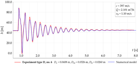 Figure 4, Figure 5, Figure 6, Figure 7, Figure 8 and Figure 9 show that the pressure wave is strongly damped and time-dispersed. A particularly smooth h(t) function was recorded during experiments no. 1 and no. 3 (Figure 4 and Figure 6, respectively). For these tests, measurements were conducted using a pipe with a wall thickness of 2.4 mm (with an inner diameter of 35.2 mm) and a pipe with a wall thickness of 3.0 mm (with an inner diameter of 44 mm). For both of these tests (experiments no. 1 and no. 3), the ratio of the inside diameter to the wall thickness of the pipes was equal to D/s = 15. For other experiments (Table 1), the wall thickness to internal diameter ratio was constant and equalled D/s = 9. It is apparent from Figure 4 and Figure 6 that during the water hammer experiments in the pipeline system with thinner pipe walls, a stronger damping of the pressure wave can be observed. Additionally, it can be noticed that the values of the pressure wave velocity for pipes with thinner walls are lower compared to those for the rest of the experiments (Table 2). These lower values of the pressure wave velocity confirm a faster attenuation of disturbances in viscoelastic pipes with thinner walls.