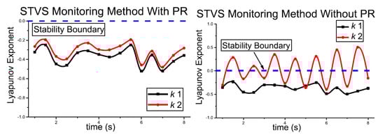 There are two main directions of LE usage in short-term instability monitoring. One approach is to monitor voltages, as shown in Equations (1) and (2). This effectively results in short-term voltage instability monitoring. Another approach is to utilize the same concept and apply it to rotor angle (transient) stability [16,17]. The idea remains the same, while the monitored variables of interest become rotor angles of the synchronous generators in the system, replacing voltage in Equations (1) and (2). As described in Section 2, it is undeniably beneficial if a single approach can be applied to more than one short-term instability phenomenon. For instance, in [18], merged monitoring of short-term voltage stability and rotor angle transient stability is proposed, utilizing Lyapunov exponents.