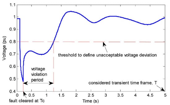 where is the voltage magnitude of the bus i at time t, is the pre-disturbance voltage magnitude of the bus i, and is the threshold used to define unacceptable voltage deviation level. The authors in [20] suggested using = 20%, although it depends on the particular system in question.