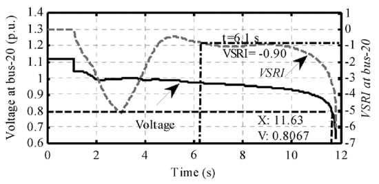 When the index converges to zero, the system voltage is considered stable, while otherwise, it might be an indication of instability. An illustrative example is shown in Figure 6, taken from [31], which demonstrates a case of generator outage leading to voltage instability. Voltage and VSRI values of one busbar are shown as a function of time.