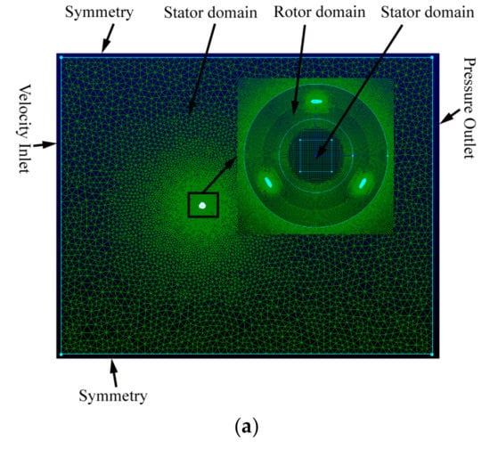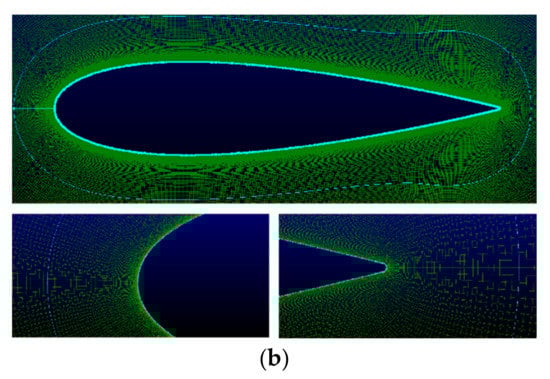 Two-dimensional numerical simulations are conducted on the VAMCT using the computational fluid (CFD) method based on ANSYS workbench, and the geometrical parameters of the turbine are presented in Table 1. Re = 300,000 is close to laminar flow over most of the blade. The sliding mesh strategy is applied to realize the rotating motion of the turbine. As shown in Figure 1, the computational domain consists of two parts: the ring-shaped rotation domain and the stator domain. The outside region is a large rectangle area, and the velocity inlet is 38 m (38D) away from the rotor. To ensure the accuracy of near-wall simulation of the blade, a structured mesh is set on the blade surface, and the normal distance to the nearest wall is set as 1.24 × 10−5 mm. The mesh is refined at the leading and trailing edge of the blade, as illustrated in Figure 1b. Abdolrahim, Francesco, and Daroczy [,,] found that Transition Shear-Stress Transport (TSST) model and Shear-Stress Transport (SST) k-ω turbulence model could accurately simulate the flow field characteristics around the VAMCT, so the SST k-ω turbulence model is selected.