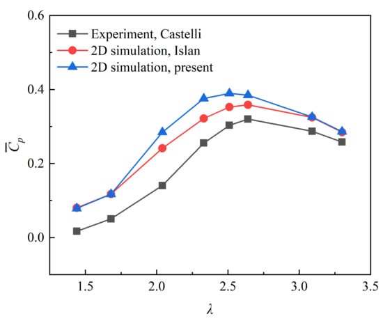 Referring to the method adopted by researchers Ye, Wang, and Sun [,,], the two-dimensional numerical simulation results are compared with the experimental data [] and the numerical results [] under the same conditions to verify the reliability and accuracy of the proposed model, as shown in Figure 2. It can be seen that the trend of  curve obtained by the simulation in this paper is roughly consistent with the experimental value, and it is relatively close to the simulation results, which verifies that the numerical analysis method in this paper can accurately predict the dynamic characteristics of the turbine.