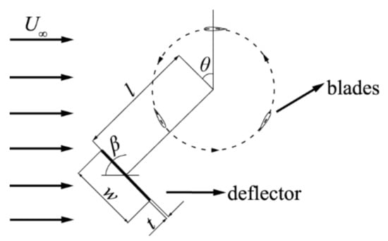 In the following section, two-dimensional simulations are conducted, and influences of geometrical parameters of the upstream flat plate on the hydrodynamic performance of the VAMCT are analyzed. As shown in Table 3, these parameters are the distance between the deflector and turbine rotor l, the deflector length w, and the deflector installation angle β (the angle between the deflector and the free stream). The spatial arrangement of an upstream flat plate deflector relative to the turbine rotor is sketched in Figure 3. The numerical simulations are based on the NACA0021 blade with a constant upstream velocity U∞ = 2 m/s.