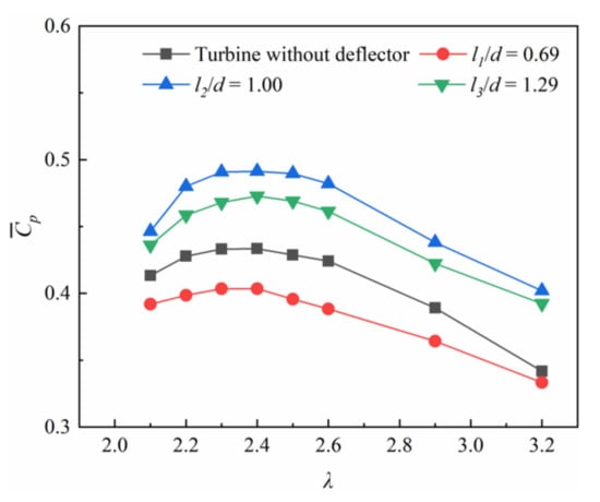 - With the increase in the deflector length, more accelerated fluid is guided to the turbine. At the same time, the low-speed fluid region behind the deflector is also extended, and it would deteriorate the energy extraction efficiency of the turbine. Therefore, it is crucial to choose a deflector with an appropriate length to improve the averaged power coefficient of the VAMCT.