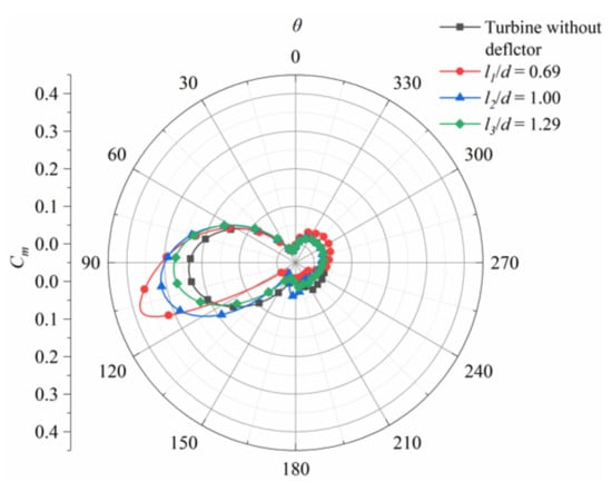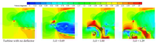 Figure 5 shows the variation of the instantaneous moment coefficient Cm of one hydrofoil in a rotation cycle at λ = 2.4. It can be seen that the increment in the moment coefficient caused by the deflector is mainly concentrated in the upstream area (θ = 0–180°), while less improvement is achieved in the downstream (θ = 181–360°). Figure 6 presents the velocity contour for VAMCT with a deflector of different l/d. When the fluid passes through the deflector, it can be observed that the fluid at the upper and lower ends of the plate is accelerated. When the deflector is close to the turbine (l/d = 0.69), the accelerating fluid has a significant effect on the blade, and the peak value of the moment coefficient curve is greatly increased. However, the low-speed fluid behind the deflector also affects the hydrodynamic performance of the hydrofoil. It causes the Cm to drop sharply in the range of θ = 105–150°, and as a result, there exists a negative effect on the averaged power coefficient of the VAMCT. For l/d = 1.00, it could be found that the accelerating fluid at the upper side of the deflector deflects toward the lower side, which weakens the influence of low-speed fluid on the performance of the turbine. Therefore, without the interference of the near-wake region, the averaged power coefficient of the turbine is improved. As the distance further increases to l/d = 1.29, the fluid velocity encountered by the VAMCT is decreased. Although the averaged power coefficient of the turbine blade still improves, it is lower than that of the VAMCT with the deflector of l/d = 1.00.