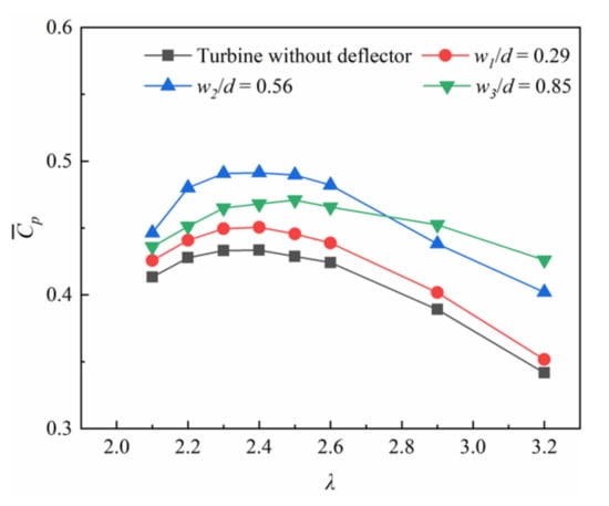 Averaged power coefficient Cp vs. λ for varying the deflector length (w/d).