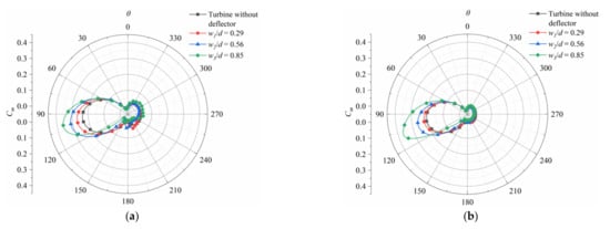 Keeping l/d = 1.00 and β = 45.0°, the effect of deflector length on hydrodynamic performance of the VAMCT is analyzed by varying w/d from 0.29 to 0.85, as shown in Figure 7. For w/d = 0.29, 0.56, and 0.85, the maximum power coefficient of the turbine is 45.1%, 49.1%, and 46.8%. Compared with the turbine without a deflector, the maximum power coefficient is increased by 3.97%, 13.37%, and 7.99%, respectively.