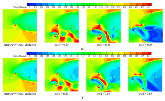 Velocity contour for the VAMCT with the deflector of different length when (a) λ = 2.4 and (b) λ = 3.2.