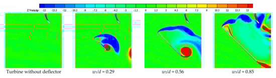 Figure 8 shows the instantaneous moment coefficient of one blade of the VAMCT with a deflector of different length during one rotation cycle at λ = 2.4 and λ = 3.2. It could be found that as the length of the deflector increases, the peak value of the moment coefficient Cm is improved, due to the fact that more accelerating fluid is directed to the turbine. Figure 9 shows the velocity contour for the flow field near the VAMCT. When λ = 2.4, in the range of θ = 0–120°, the improvement in fluid velocity causes an increase in the instantaneous moment coefficient. The accelerating fluid on the upper side of the short deflector (w/d = 0.29) has a weak effect on the hydrofoil, and there is a slight increment in the averaged power coefficient. For w/d = 0.85, the instantaneous moment coefficient has the largest increment in the range of θ = 0–120°. However, as shown in Figure 9and Figure 10, both the free shedding vortex formed at the upper side of the deflector and the near-wake region reduce the flow velocity near the hydrofoil in the range of θ = 120–210°, resulting in a sharp decrease in the instantaneous moment coefficient. The performance improvement of a VAMCT depends on the sum of the moment increment and moment decrease in one period, so the averaged power coefficient of the deflector with w/d = 0.85 is inferior to that of the deflector with w/d = 056 at λ = 2.4. When the turbine operates at a high tip speed ratio, the blockage effect is strengthened and the accelerated flow tends to go around the turbine. Therefore, when w/d = 0.29 and 0.56, the effects of the accelerating fluid on the upper side of the deflector are weakened, resulting in a decrease in the instantaneous moment coefficient of the turbine blade in the range of θ = 0–120°. However, the flow direction of the accelerating fluid from the deflector with w/d = 0.85 is basically consistent with the mainstream direction, and compared to λ = 2.4, the velocity of the fluid around the blade does not change remarkably. Hence, at a high tip speed ratio, the increase in the moment coefficient of the VAMCT of the deflector with w/d = 0.85 is significantly higher than that of the deflector with other lengths, as shown in Figure 7.