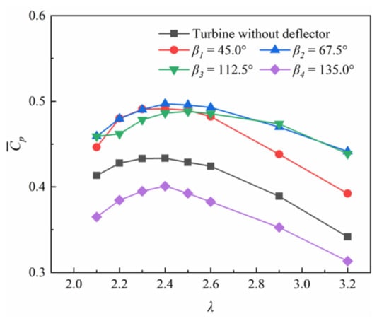 Averaged power coefficient Cp vs. λ for varying the installation angle of deflector (β).
