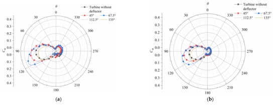 In this section, the influence of deflector installation angle β (the angle between the deflector and the freestream) on the hydrodynamic performance of VAMCTs is explored. The corresponding parameters are l/d = 1.00 and w/d = 0.56. The selected installation angles of the deflector are 45.0°, 67.5°, 112.5°, and 135.0°, respectively. Figure 11 shows the effect of the installation angle of the deflector on the averaged power coefficient of the VAMCT at different λ. Compared with the turbine without a deflector, the averaged power coefficient of the VAMCT is significantly increased when β is 45.0°, 67.5°, and 112.5°. When β = 67.5°, the averaged power coefficient is greatly improved at different λ, and a maximum increment of about 14.5% is achieved when λ = 2.4. When β = 135.0°, the deflector has a negative effect on the hydrodynamic performance of the turbine, and its averaged power coefficient is greatly reduced.
