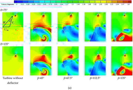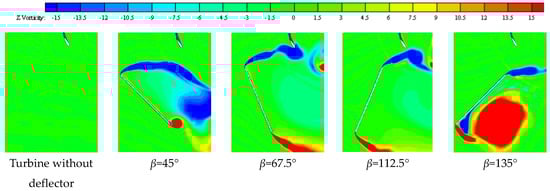 Figure 12 shows the variation in instantaneous moment coefficient for the deflector with a different installation angle. At λ = 2.4, when θ = 25–90°, the averaged power coefficient of the VAMCT gradually decreases with the increase in β. For β = 45°, from the velocity contour of the flow field around the turbine, as shown in Figure 13a, the accelerating fluid on the upper side of the deflector deflects to the lower side. The change in the velocity and direction of the fluid near the blade induces a large angle of attack, which is conducive to the generation of the positive torque of the turbine. When θ = 90–115°, an accelerating flow channel is formed between the blade and the deflector []. In the case of β = 67.5° and 112.5°, the accelerating fluid is nearly consistent with the main flow direction and the area of the flow channel is the smallest, so there exists a significant improvement in the peak value of the instantaneous moment coefficient curve. However, in the range of θ = 120–150°, the near-wake region behind the deflector is extended and has negative effects on the turbine performance. Additionally, the shedding vortex from the deflector of β = 67.5° and 112.5° collides with the blade, which also greatly obstructs the energy obtained by the blade from the fluid, as shown in Figure 14. As β further increases to 135°, no obvious accelerating fluid on the upper side of the deflector can be observed, and the deflector prevents part of the fluid from going through the turbine, leading to a significant decrease in the hydrodynamic performance of the VAMCT.