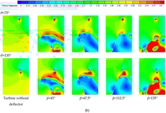 When λ = 3.2, the instantaneous moment coefficient of the VAMCT decreases due to the blockage effect. As can be seen from Figure 13b, compared with the deflector of β = 67.5° and 112.5°, the region and the speed of the accelerating fluid on the upper side of the deflector of β = 45° are reduced, leading to a significant drop in the averaged power coefficient. Although the deflector of β = 67.5° and β = 112.5° can improve the averaged power coefficient of the VAMCT at different λ, the effect of the low-speed region behind the deflector causes the fluctuation amplitude of the moment coefficient to increase in the range of θ = 0–180°, which is not conducive to the safe and stable operation of the turbine.