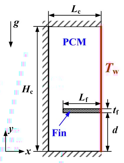 A constant temperature, Tw, is imposed on the right surface, while the adiabatic condition is used for other surfaces, as presented in Figure 1. Lauric acid and aluminum are respectively selected as the phase change medium and fin material, whose thermo-physical properties are shown in Table 1 and Table 2, respectively.