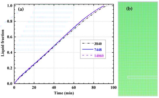 The grid independence test is carried out to eliminate the effect of grid number. The test result in terms of γ for df = 0.20 is presented in Figure 2a, where the grids with 3840, 7448 and 14,060 quadrilateral cells are examined. As the cell number increases, the deviation between adjacent grids reduces. For the compromise of computation cost and accuracy, the grid with 7448 cells is picked up. Similar tests are performed for other df and no fin cases, and the grids with 7448 quadrilateral cells are also selected. Figure 2b shows the schematic view of the grid which shares high quality with the maximum aspect ratio of 1.55 and minimum orthogonal quality of 0.9997.