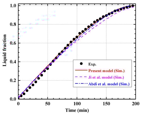 The result obtained by the present model for the no fin scheme is compared to the experiment conducted by Kamkari et al. [45] and the simulations performed by Ji et al. [22] and Abdi et al. [33], as shown in Figure 3. At the beginning, all simulation models agree well with each other, but predict melting process slightly faster than experiments. This is reasonable since the elevation process of the right surface temperature, Tw, from the initial value, T0, of 25 °C to the target value of 70 °C, occupying approximately 4 min, is not considered in the simulation. In the middle and late stages, as in the Abdi et al. model, the present model matches well with experiments. A difference is presented between the present model and Ji et al. model, because of the adopted Amush, 106 for the present model and 105 for the Ji et al. model.