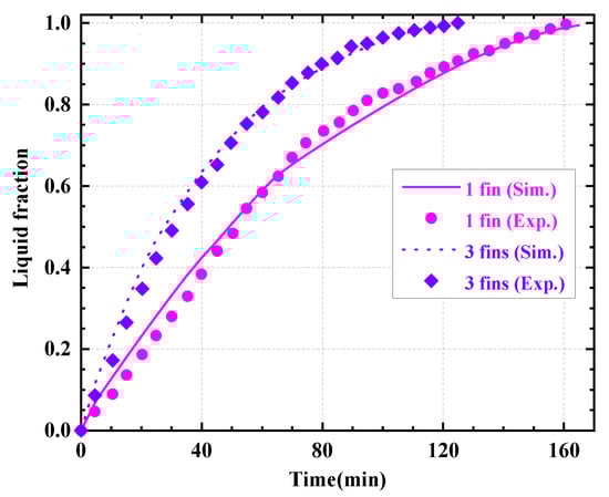 Besides, the present model is validated with the experiment performed by Kamkari and Shokouhmand [27] for the 1 fin case and 3 fins case. The validation results are shown in Figure 4. As the same reason to the no fin scheme, ignoring the temperature rising process of the right surface, the present model predicts melting process slightly faster at the beginning. In the middle and late stages, a good agreement between the present model and experiment is found.