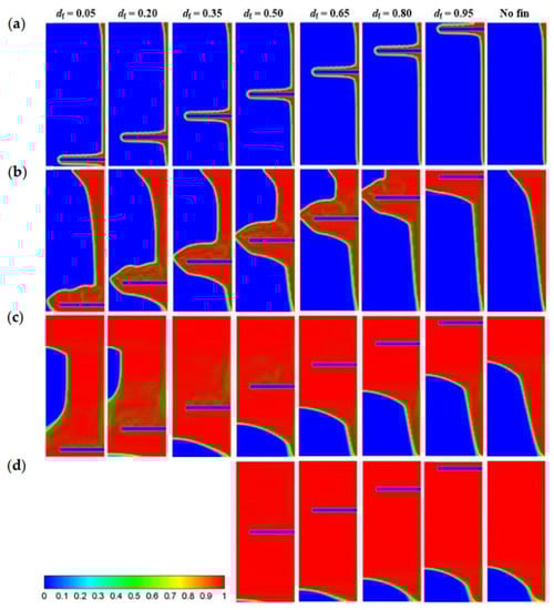 As shown in Figure 5b, as t increases to 1800 s, the liquid region expands, the interface deforms, no longer parallel to the hot surface, and several vortexes form above the fin. It is indicated that the natural convection is developed and cannot be ignored. For df = 0.05, the lower area nearly melts totally and considerable portion of solid phase melts at the upper part with the interface shape similar to the no fin case. The behavior reverses for df = 0.95 where the upper part melts completely and only a small region at the lower part, less than the no fin case, becomes liquid. The result signifies that the effect of df becomes important at t = 1800 s.