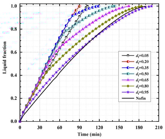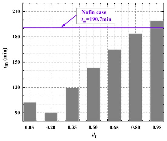 The variation of tm with df is shown in Figure 6. As df increases, tm decreases before attaining the minimum at df = 0.20 after which it increases. Compared to the no fin case of 190.7 min, melting is enhanced significantly with tm halved for df = 0.20. Besides, an interesting result is found that for df = 0.95, a scheme mounting fins closing to the top surface, tm is longer than the no fin case, which is unexpected and never reported by previous studies to the best knowledge of authors. The results demonstrate that the influence of df is notable, and fins should be arranged properly in practical applications.
